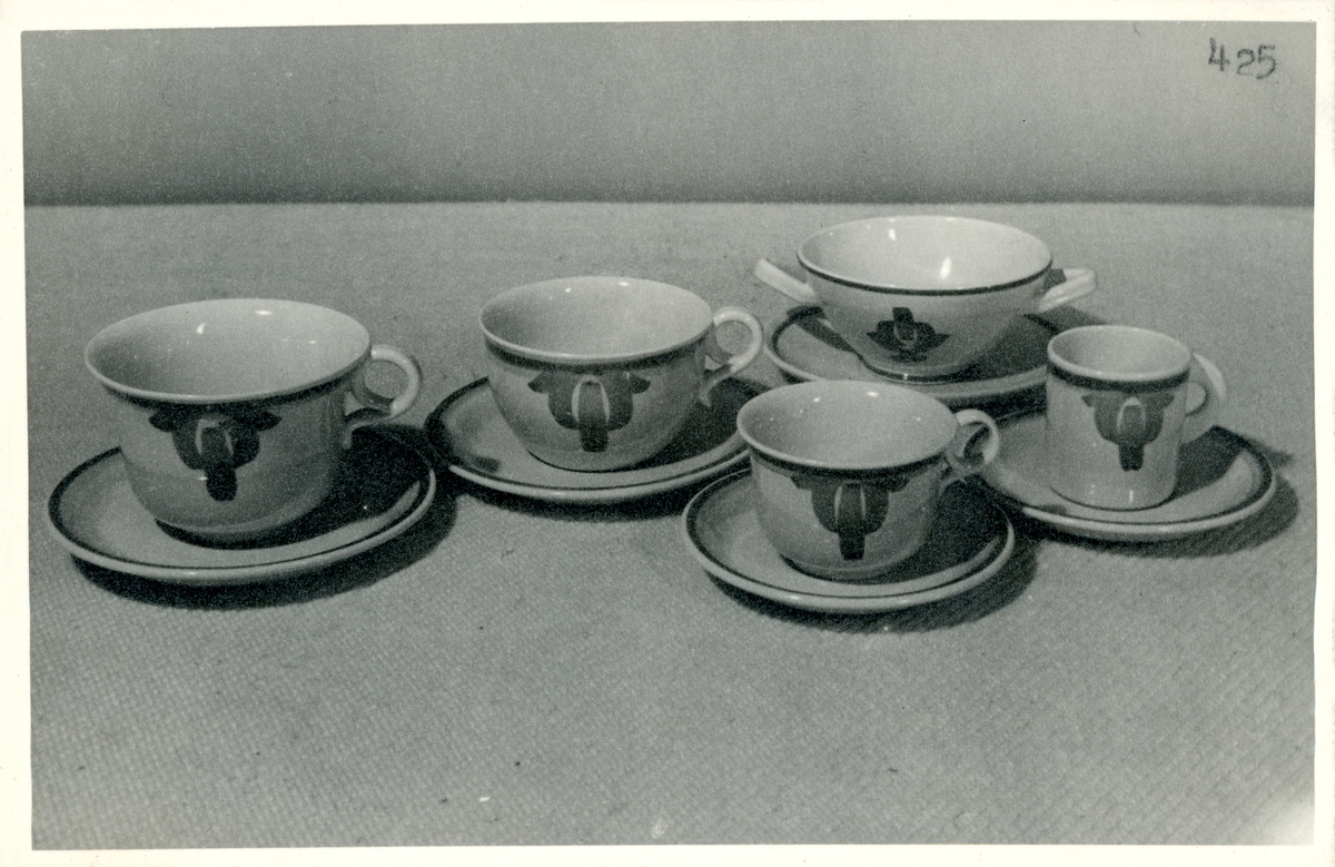 Hushållsgods från Bo Fajans. Koppar med fat. Dekor H.