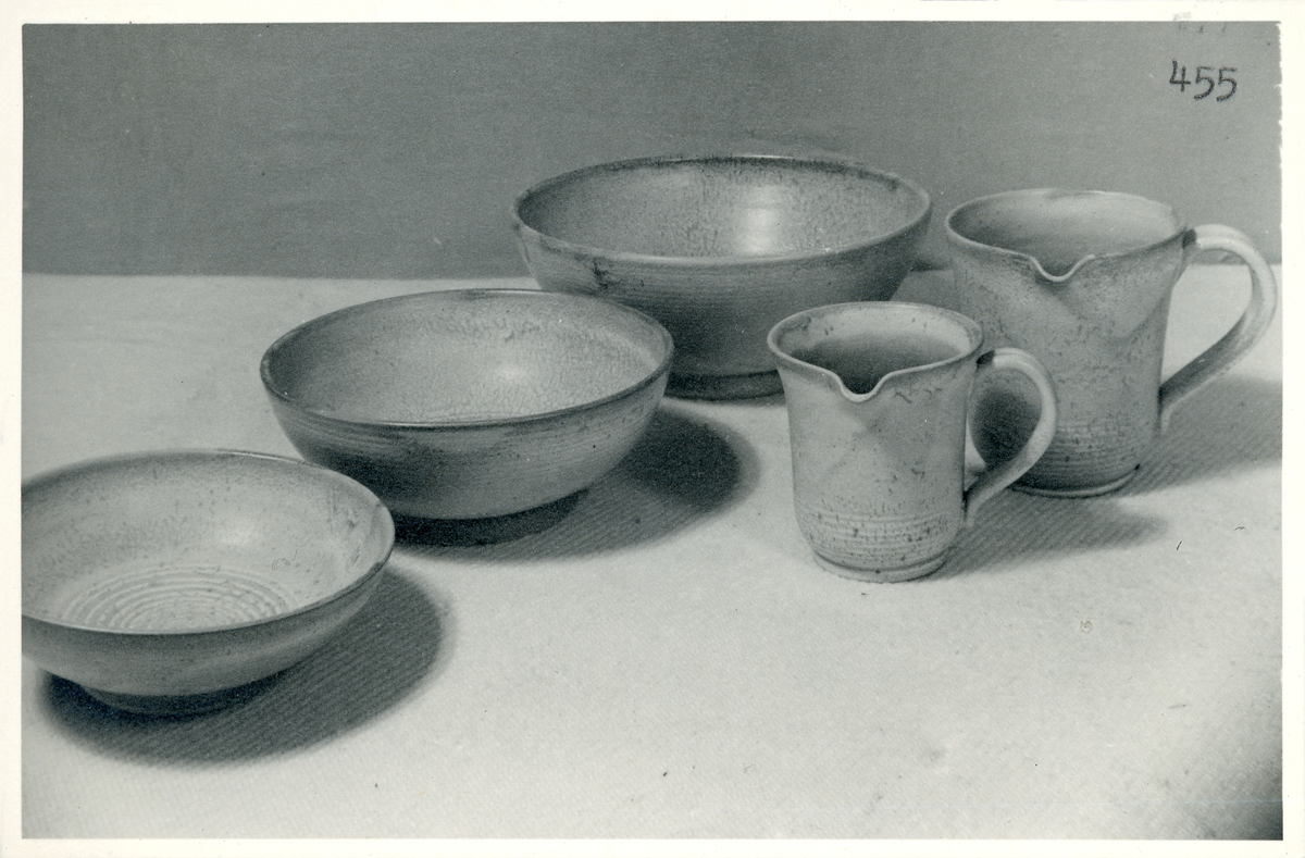 Skålar och kannor från Bo Fajans, formgivare Eva Jancke-Björk, 1900-talets mitt.