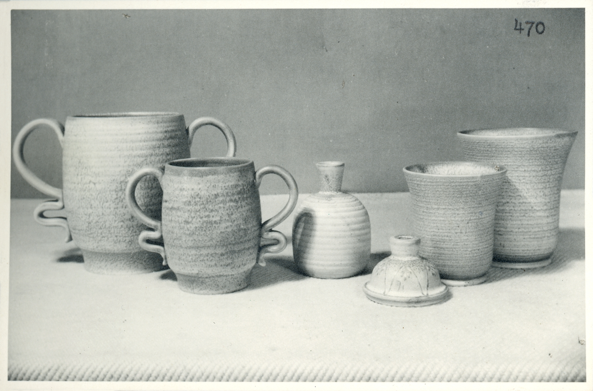 Vaser och ljusstake från Bo Fajans, formgivna av Eva Jancke-Björk och Allan Ebeling, 1900-talets första hälft. Frost glasyr.