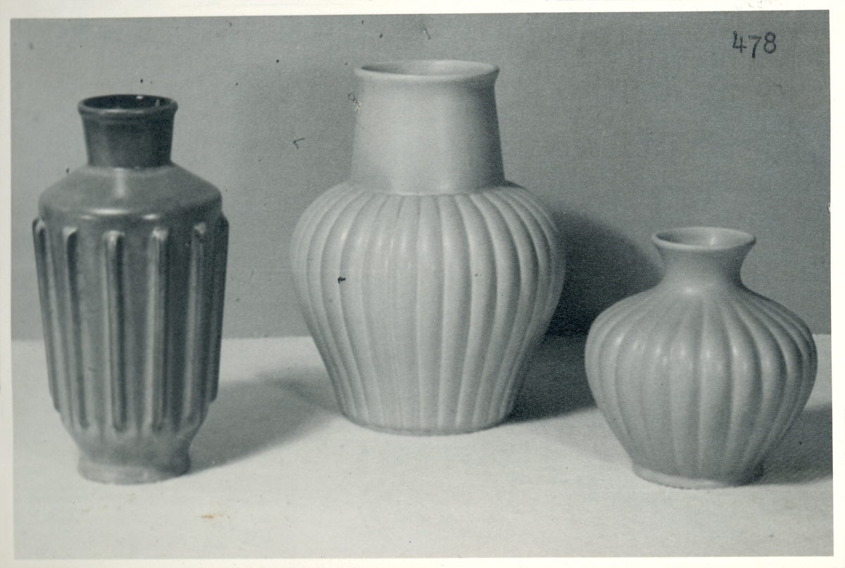 Vaser i olika glasyrer från Bo Fajans, formgivare Ewald Dahlskog, 1900-talets mitt.