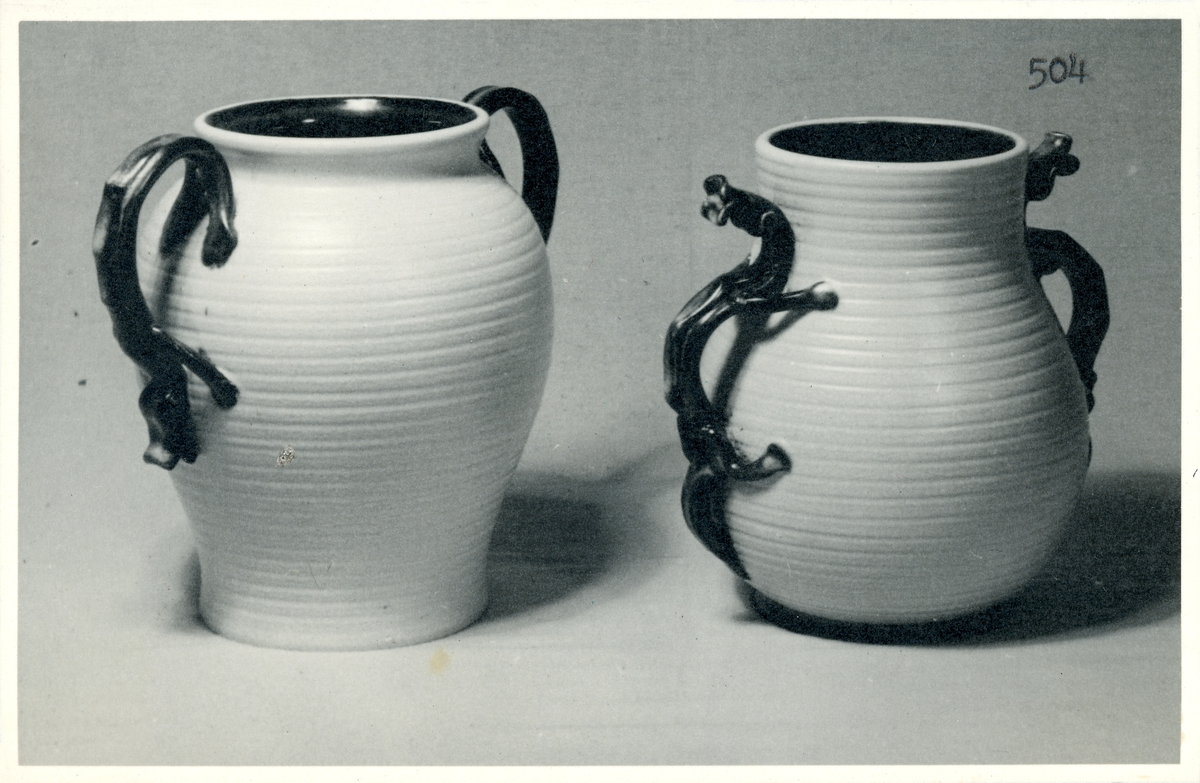 Vas B74 och B75 från Bo Fajans, formgivare Eva Jancke-Björk, 1900-talets mitt. Glasyr 510.