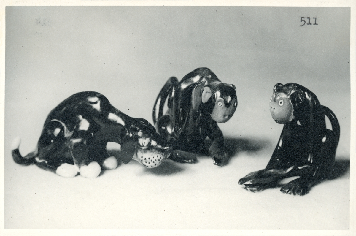 Keramikfigurer, Hund (H3), Lyssnande apa (H4) och Apa (H5), från Bo Fajans, 1900-talets mitt.