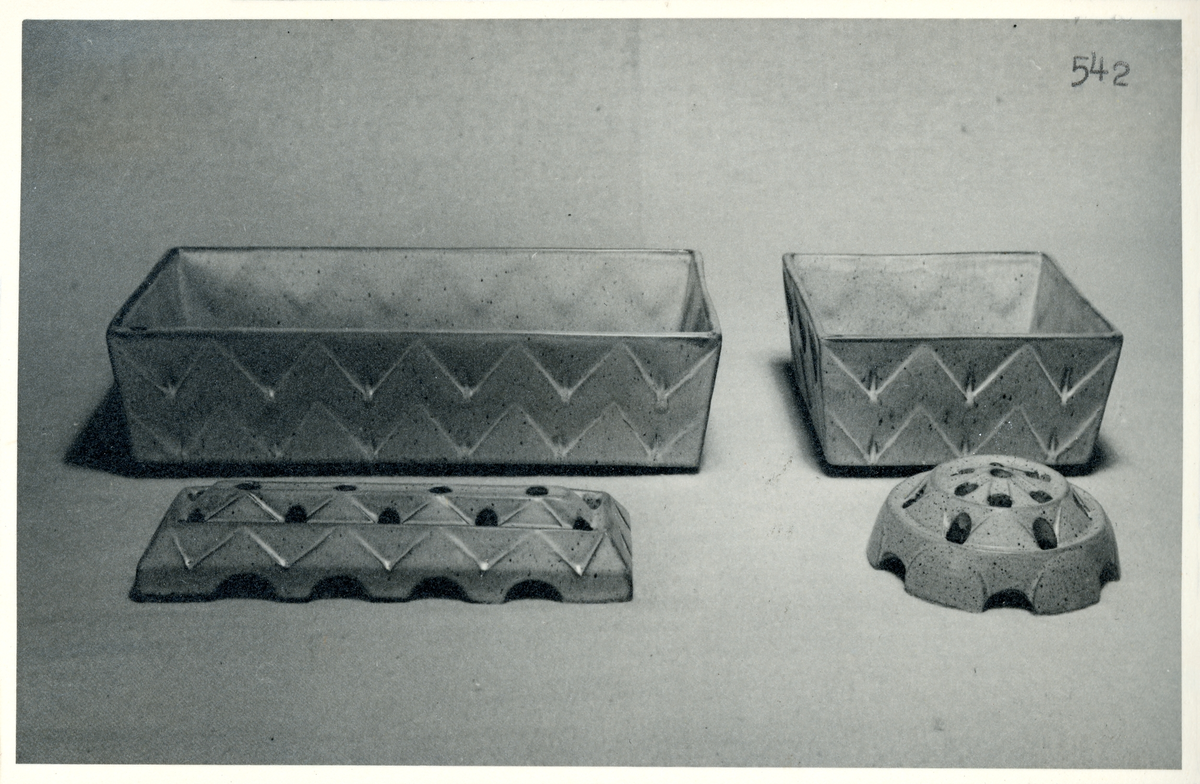 Blomskålar med insatser från Bo Fajans, formgivare Eva Jancke-Björk, 1900-talets mitt. Dekor 986.