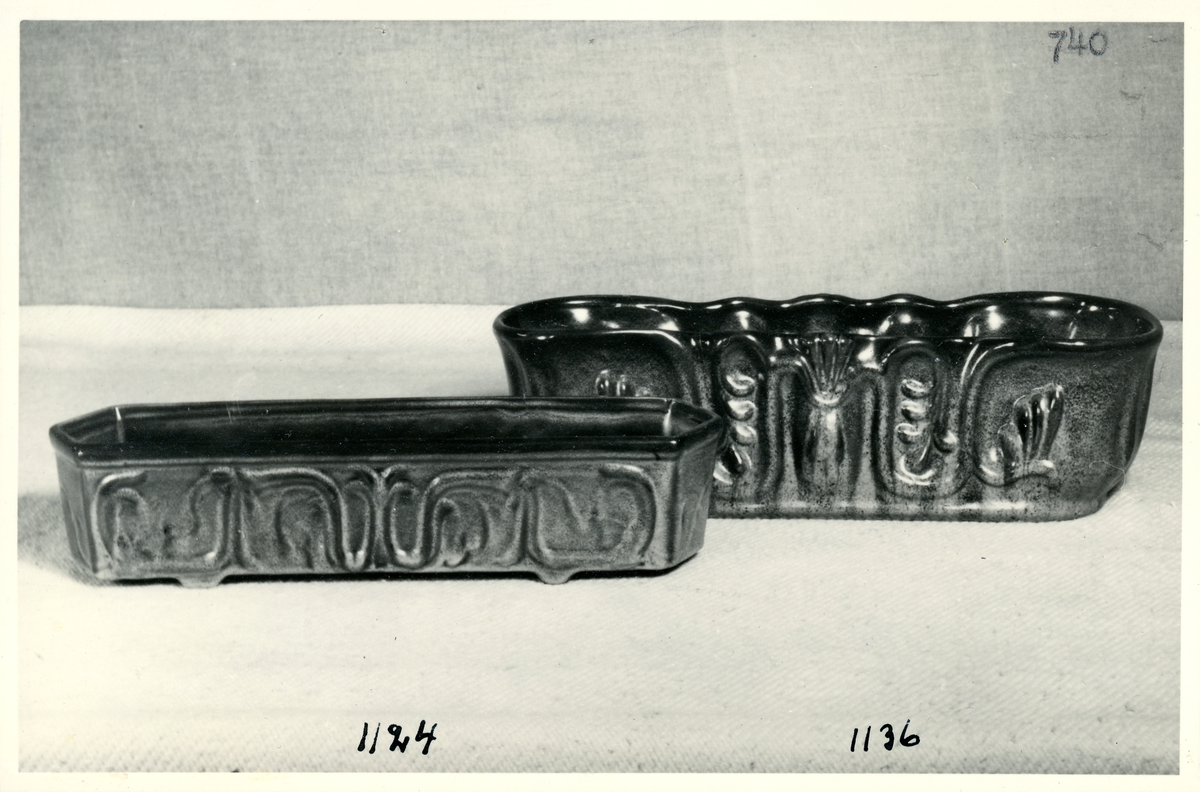 Inplanteringslåda 1124 och jardinjär 1136 från Bo Fajans, formgivare Allan Ebeling, tidigt 1900-tal.