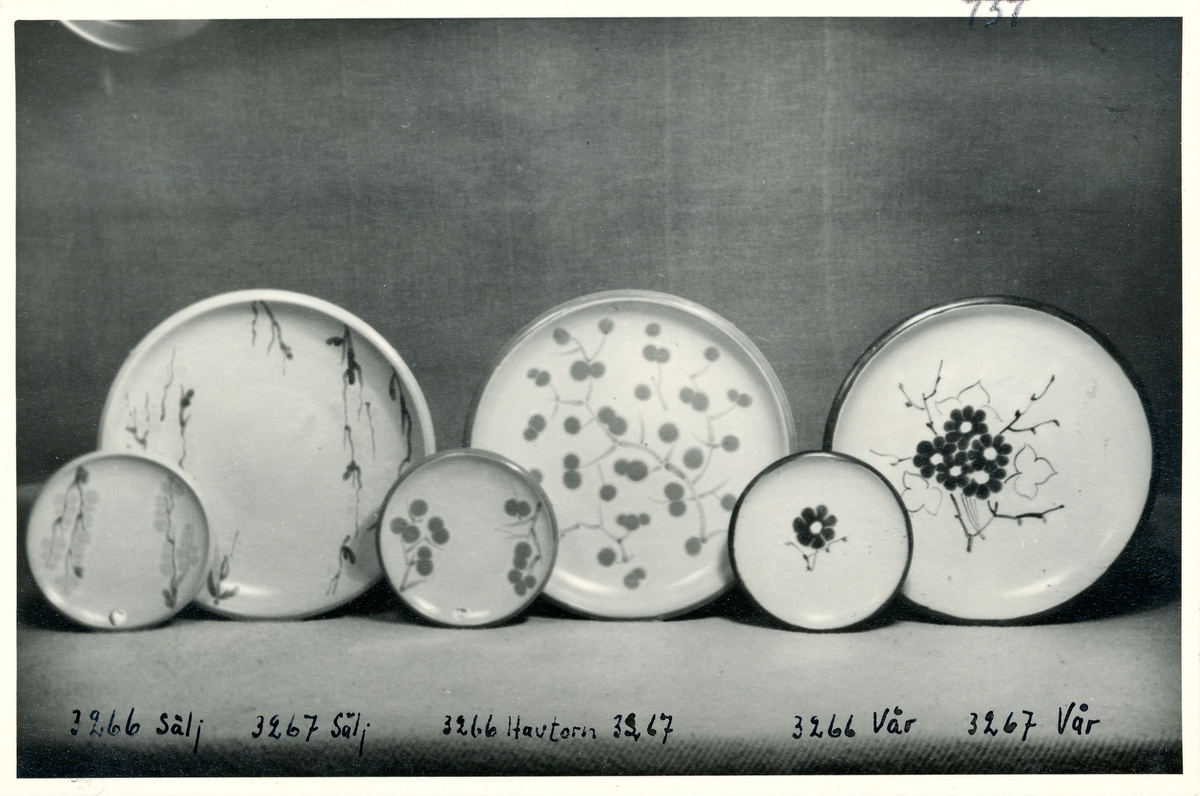 Fat (3266) och assiett (3267) i de tre dekorerna "Sälj", "Havtorn" och "Vår" från Bo Fajans, formgivna av Eva Jancke-Björk, 1900-talets mitt.