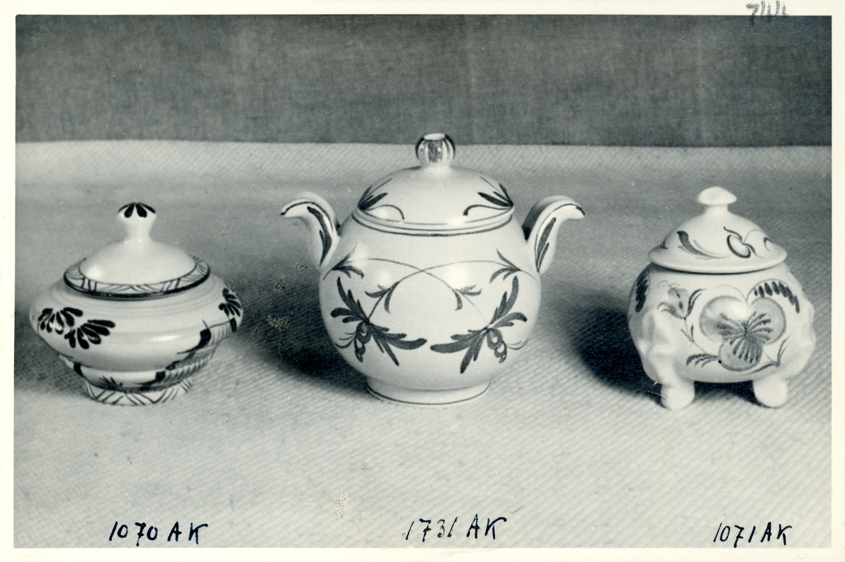 Bonbonjärer från Bo Fajans, formgivare Allan Ebeling, tidigt 1900-tal. Modellerna 1070, 1731 och 1071 i dekor AK.