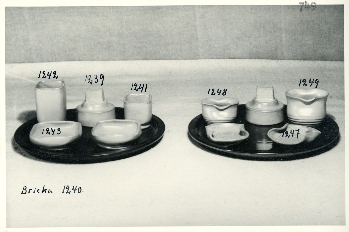 Två set med askfat, tändstickställ och dylikt från Bo Fajans, formgivare Allan Ebeling, tidigt 1900-tal.