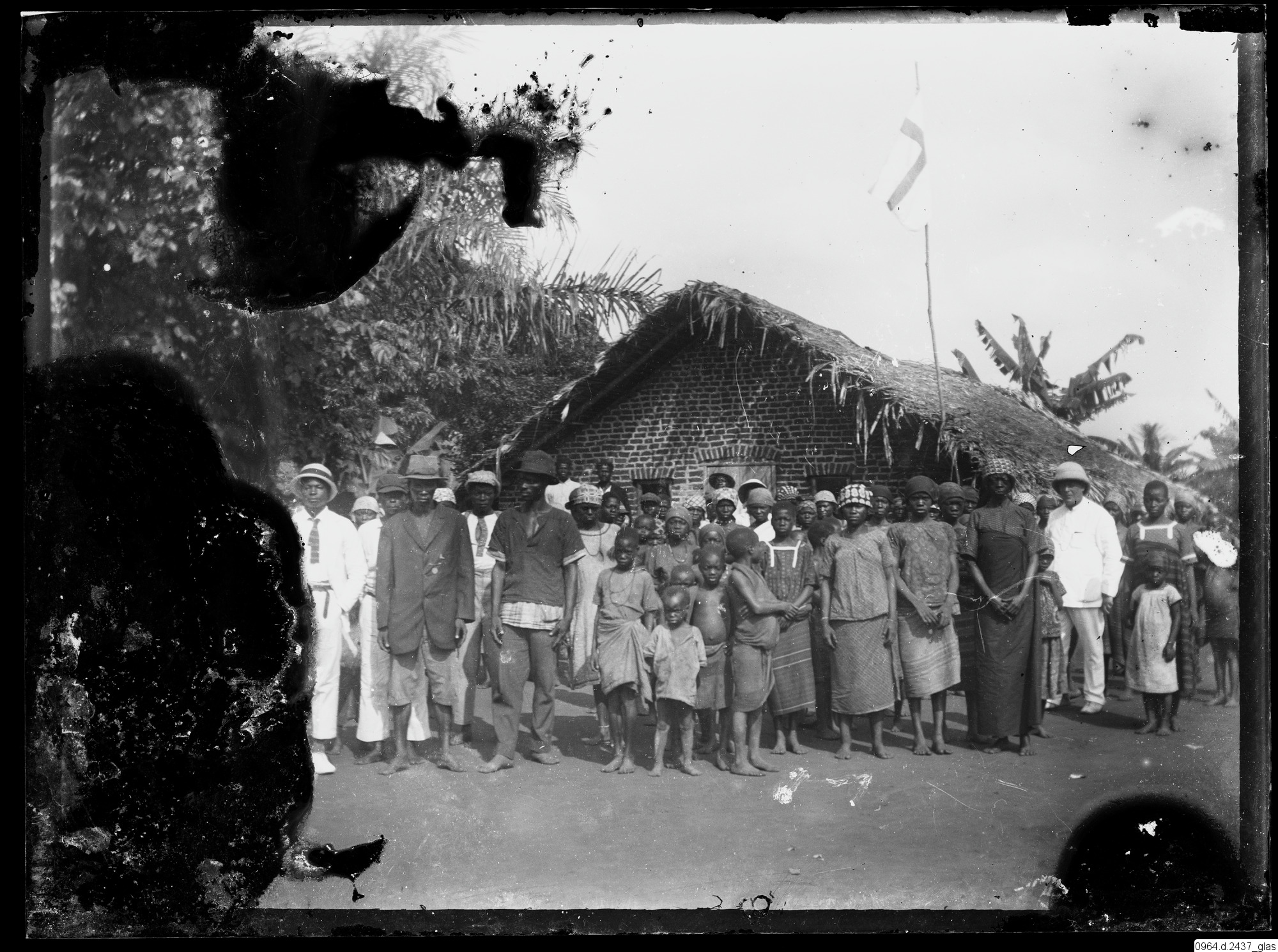 Gruppbild framför hus i tegel med grästak. Flagga och man i tropikhatt.