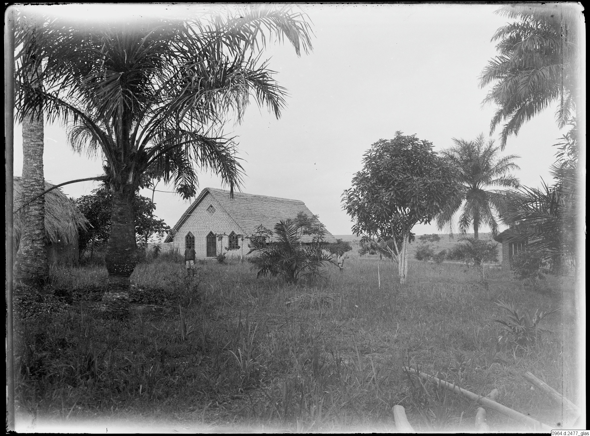 Missionsstation, tegelhus och hyddor.