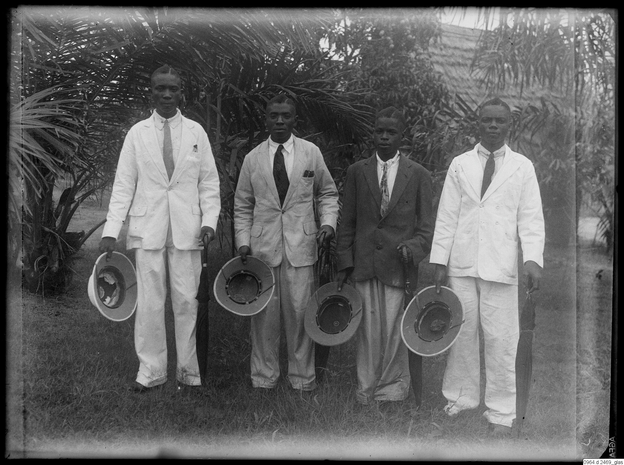 Gruppbild av fyra (4) män i kostym med tropikhatt.