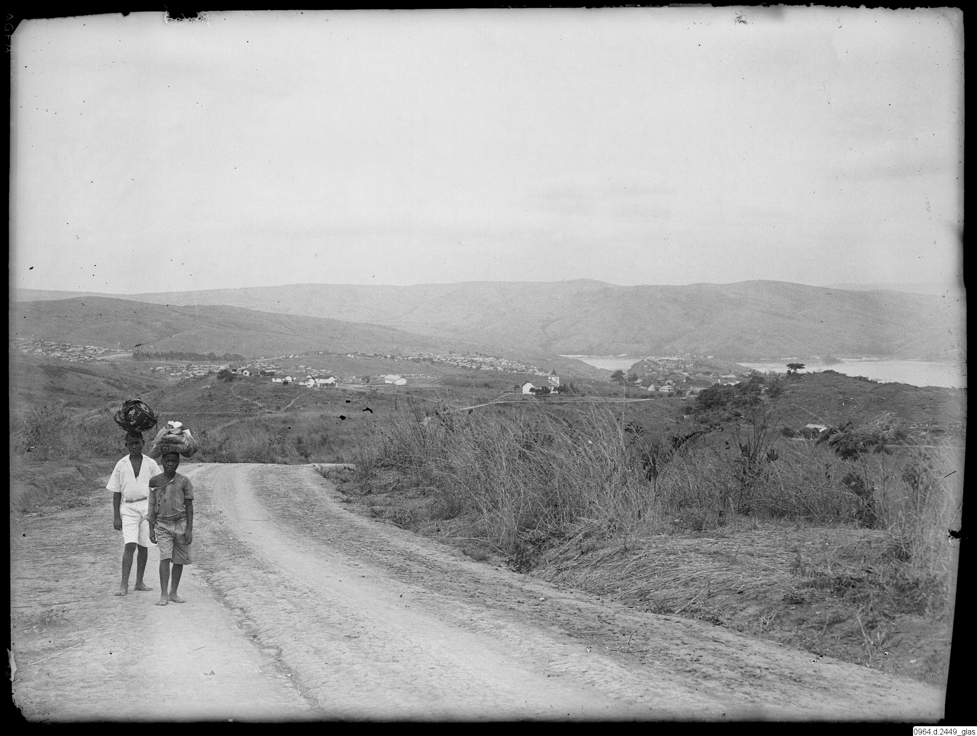 Gående män som transporterar föremål på huvudet. Vy över flod och stad.
