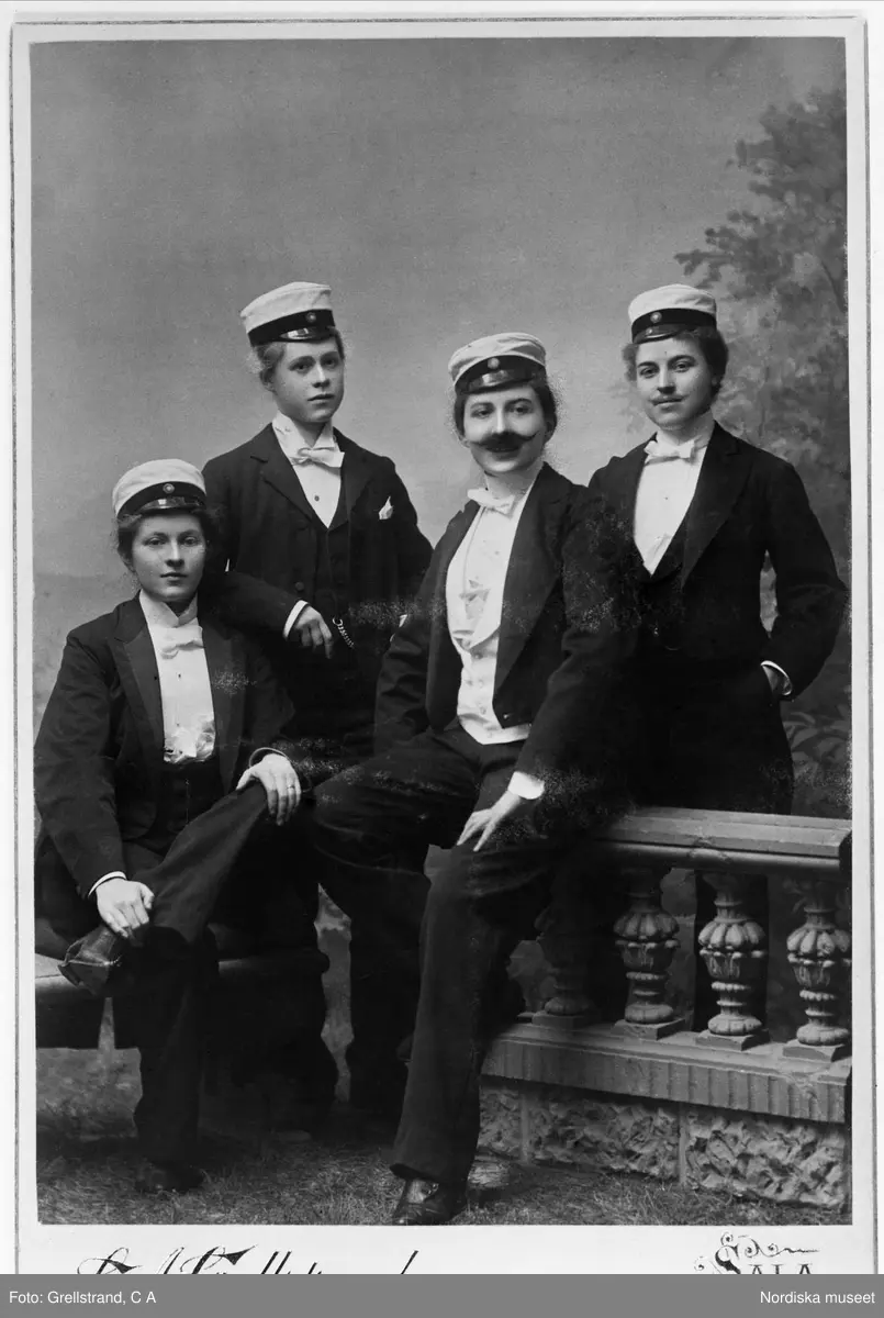 Bröllopsseder, möhippa. Arrangörerna till den troligen första "mösexan" i Sala. Fyra unga kvinnor utklädda i herrkostymer, studentmössor och lösmustacher.