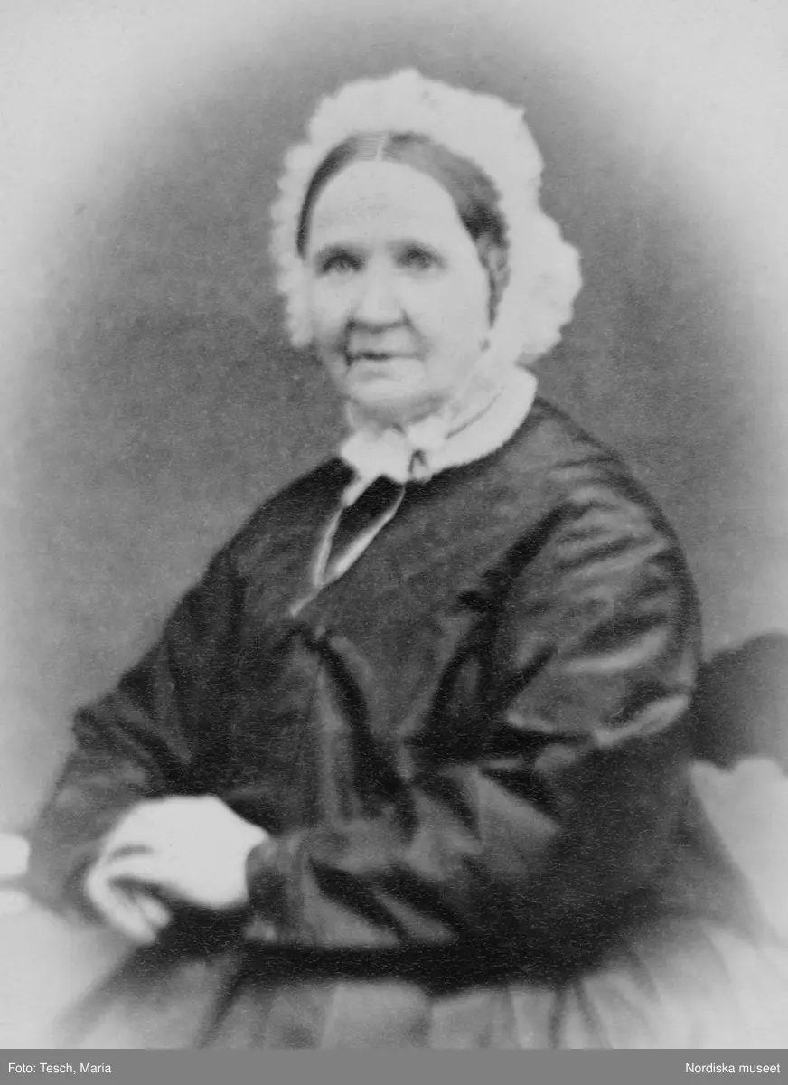 Kabinettsporträtt föreställande äldre kvinna i mörk klänning och vit mössa knuten under hakan.