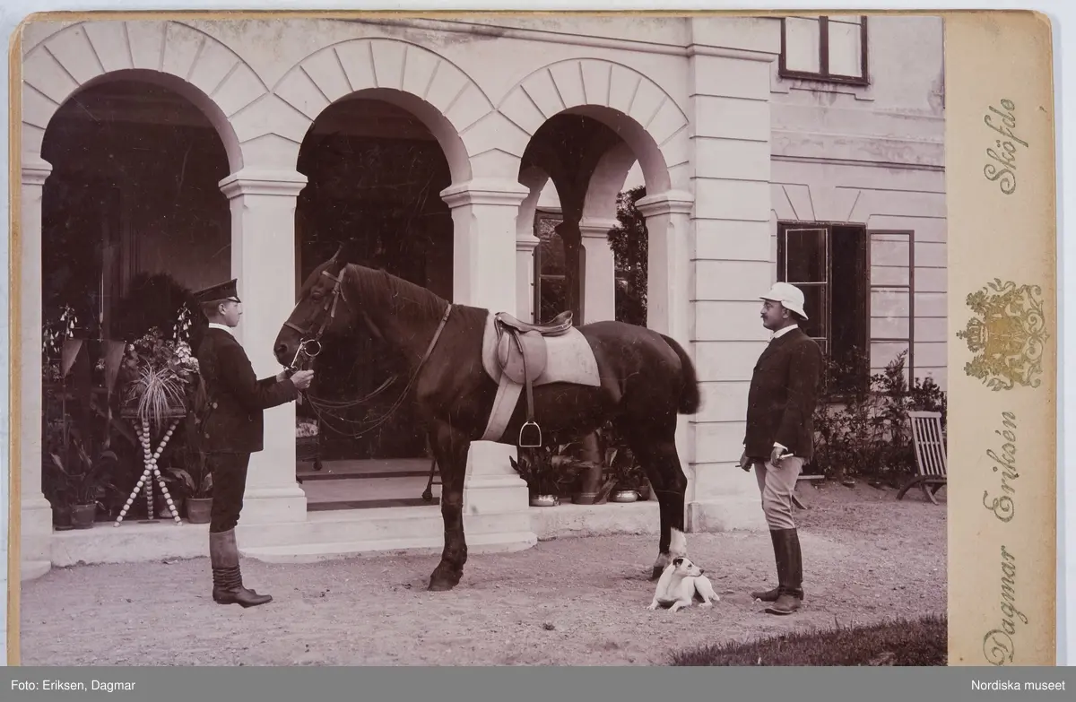 Stallpojken och löjtnanten Arthur Bäckström med en häst och en hund, framför Stora huset på Julita gård.