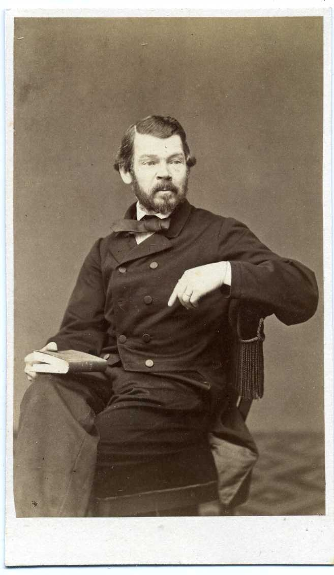 Porträtt av en riksdagsman som sitter vid ett bord, med en bok i knät. Autograf och "1866" på bildens baksida.
