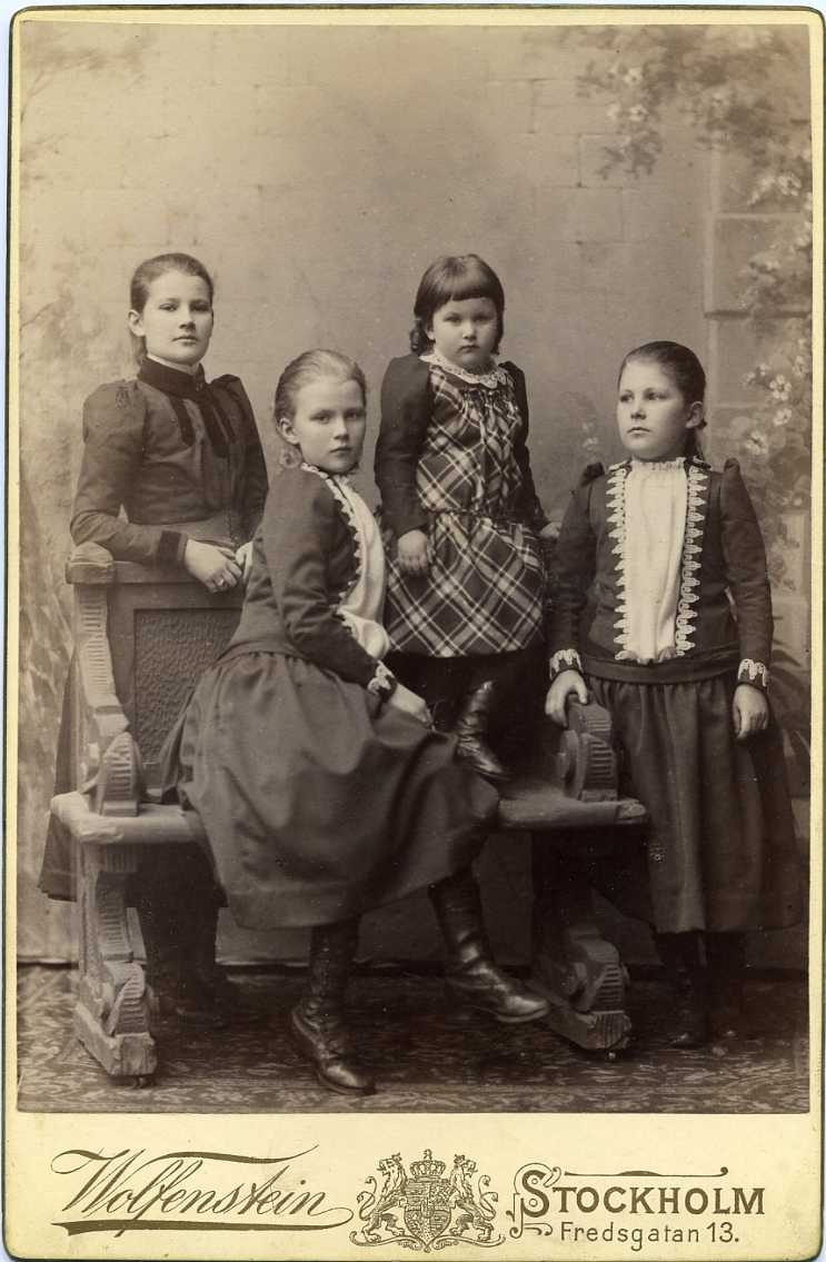 Gruppbild med fyra flickor i olika åldrar. På bildens baksida skrivet: "Fröken Bertha Barcks små små vänner."