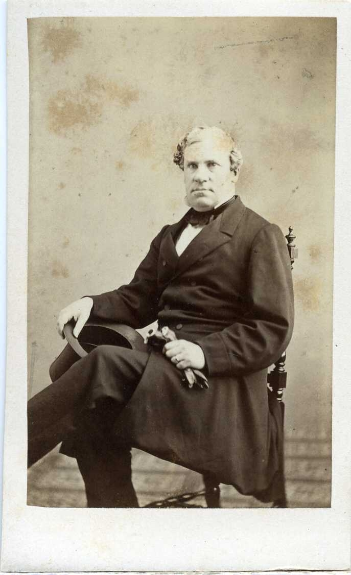 Porträtt av en riksdagsman sittande på en stol med stormhatt i höger hand och handskar i den andra. Autograf på baksidan,