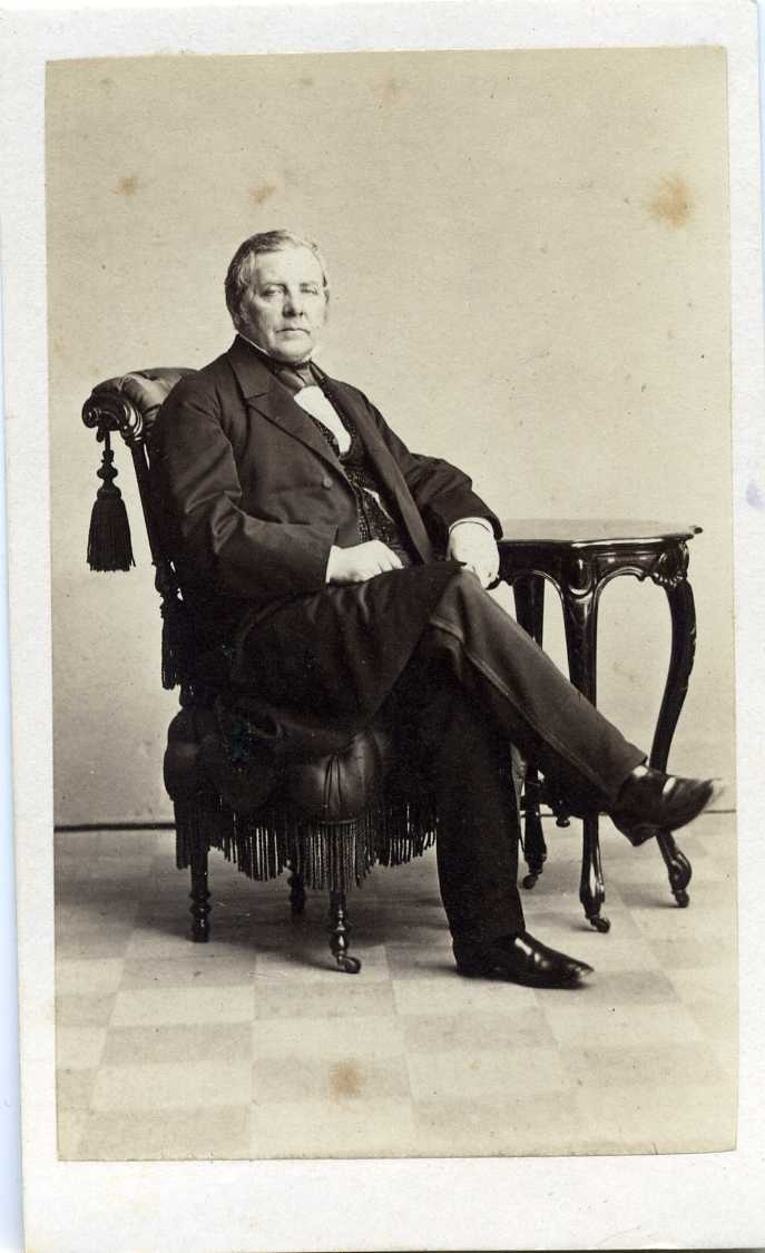 Porträtt av en riksdagsman sittande vid ett bord. Autograf på baksidan.