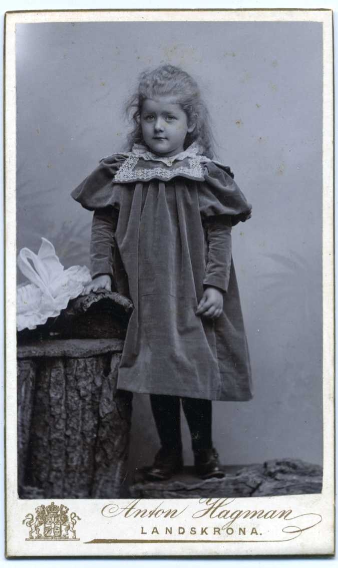 En okänd liten flicka står vid en stubbe.