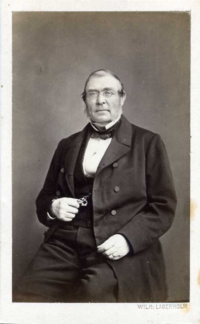 Porträtt av en riksdagsman med glasögon som sitter på en stol. Autograf på bildens baksida.