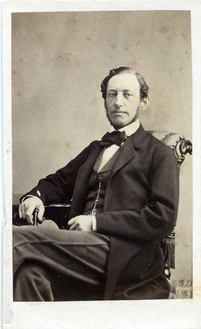 Porträtt av en riksdagsman sittande på en stol vid ett bord. Autograf på baksidan.