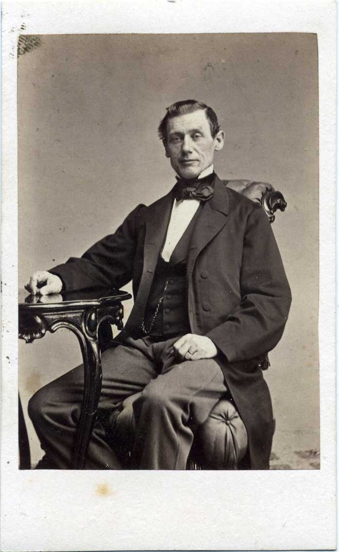 Porträtt av en riksdagsman sittande på en stol vid ett bord. Autograf på baksidan.