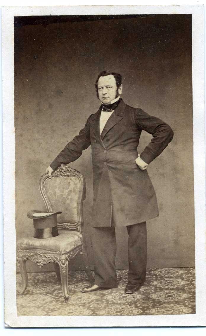 Porträtt av en riksdagsman stående med höger hand på en stolsrygg. En stormhatt ligger på stolen.
