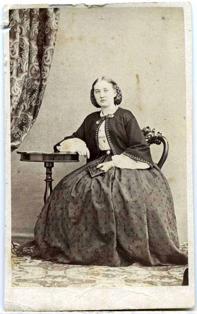 Porträtt av en kvinna som sitter vid ett bord. Möjligen anknytning till riksdagsman Stråle af Ekna.
