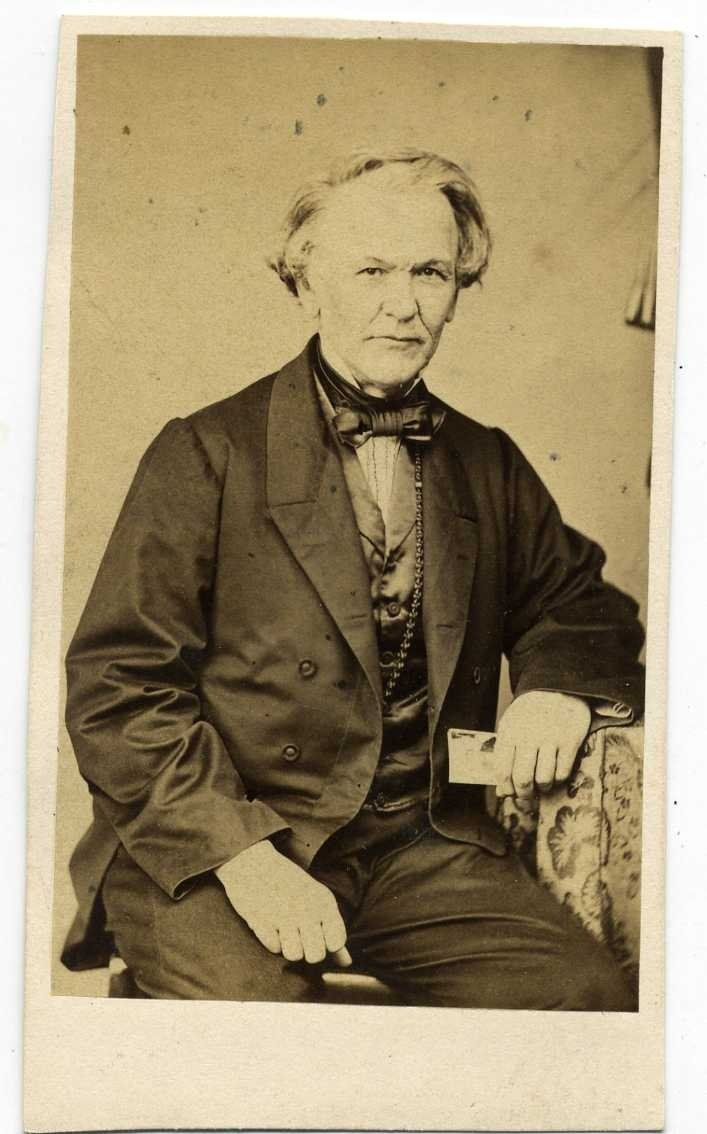 Porträtt av en riksdagsman sittande på en stol vid ett bord, med någonting i vänster hand. Autograf på baksidanl