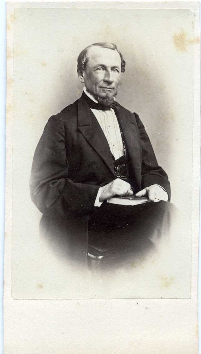 Porträtt av en riksdagsman sittande på en stol med en bok i knät. Autograf på baksidanl