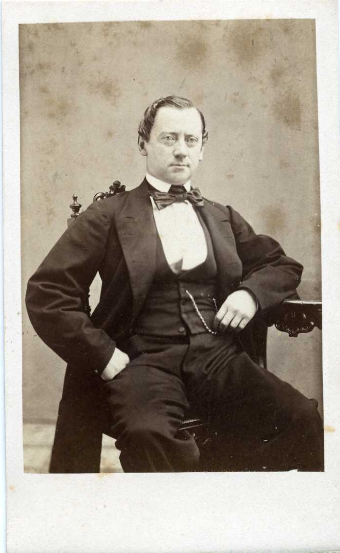Porträtt av en man sittande på en stol vid ett bord. Möjligen en riksdagsman. Autograf på baksidan.