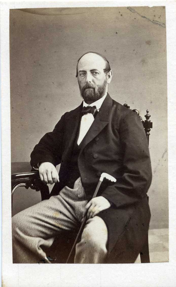 Porträtt av en man sittande på en stol vid ett bord med en spatserkäpp i vänster hand. Troligen riksdagsman, eventuellt G Hultman. Autograf på bildens baksida.