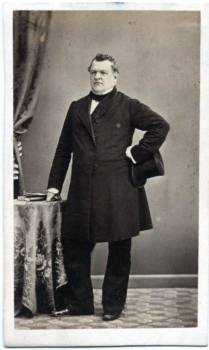 Porträtt av en riksdagsman stående vid ett bord. Autograf på bildens baksida.