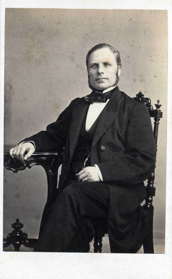 Porträtt av en riksdagsman sittande vid ett bord. Autograf på bildens baksida.