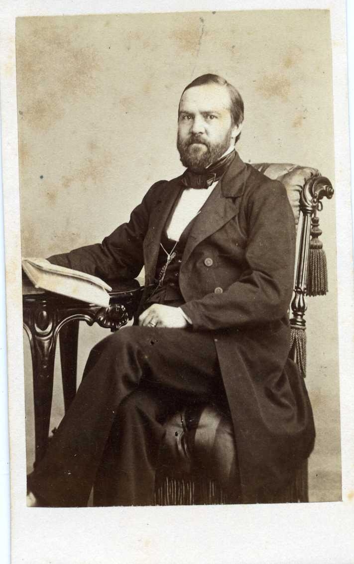 Porträtt av en riksdagsman sittande vid ett bord med en uppslagen bok. Autograf på bildens baksida.