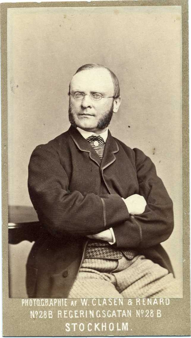 Porträtt av en (sannolikt) riksdagsman med glasögon och polisonger sittande på en stol med armarna i kors. Ljusa randiga byxor och mönstrad ljus väst. Svårtydd autograf på bildens baksida.