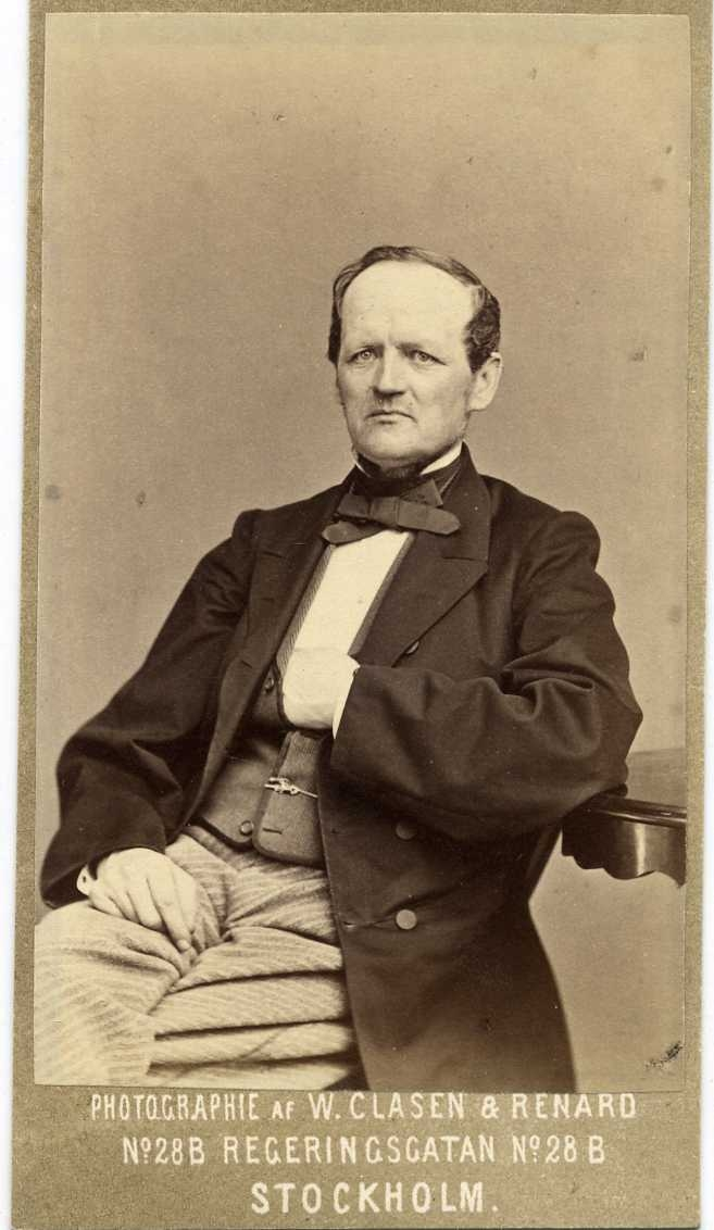 Porträtt av en riksdagsman i Napoleon-pose som sitter vid ett bord. Han bär ljusa randiga byxor. Autograf på bildens baksida.