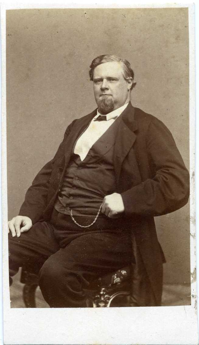 Porträtt av en riksdagsman som sitter på en stol. Autograf på bildens baksida.