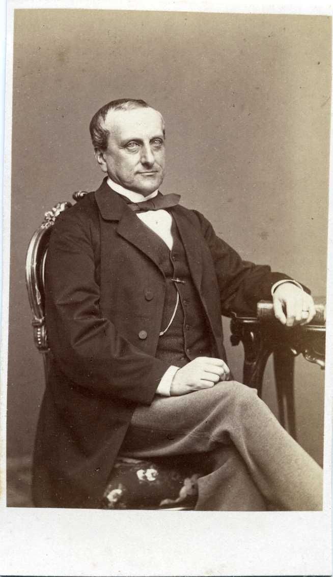 Porträtt av en riksdagsman som sitter på en stol vid ett bord. Autograf på bildens baksida.