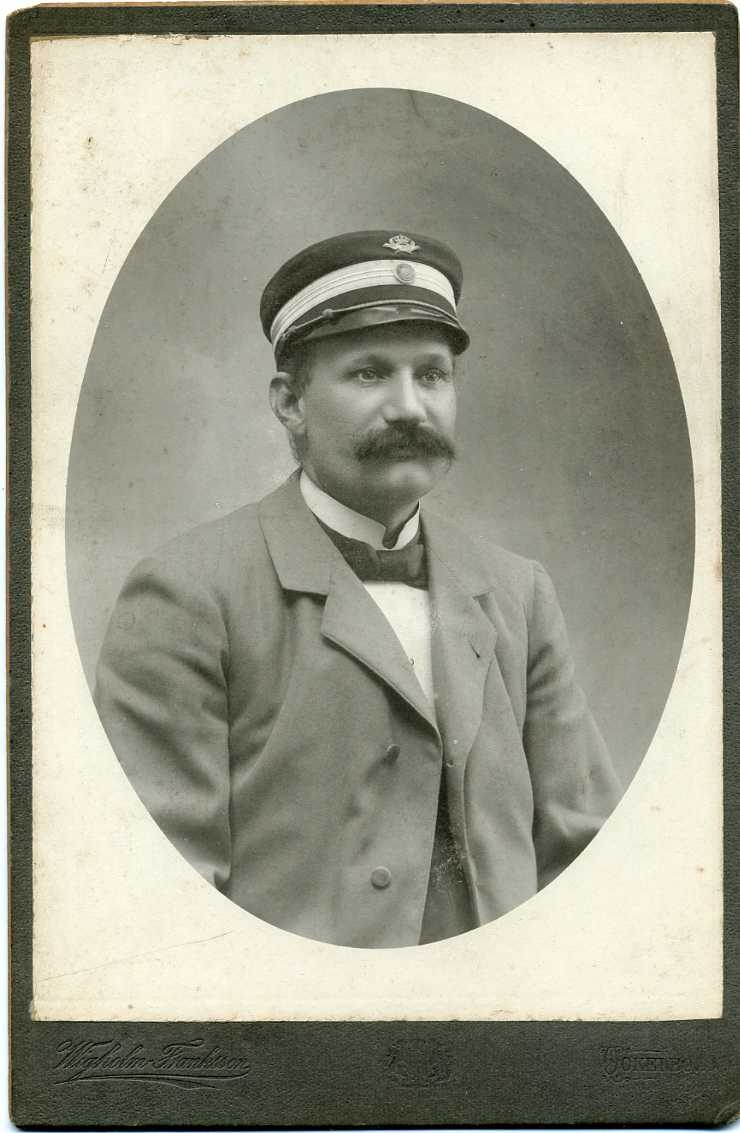 Porträtt av en okänd med uniformskeps, bröstbild. Hans förnamn är Emil. Påskrift på baksidan: "Till mina kära vänner ifrån Emil."