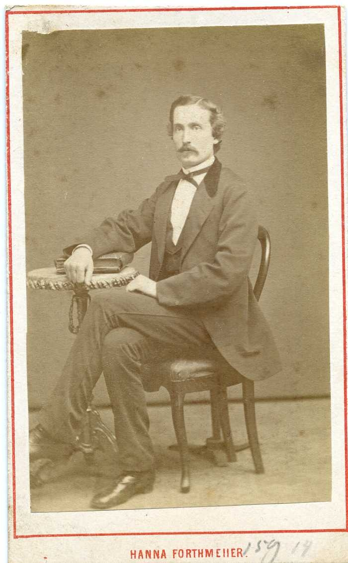 Porträtt av okänd man som sitter vid ett bord. Hans högerarm vilar på en tjock bok/fotoalbum som ligger på bordet.