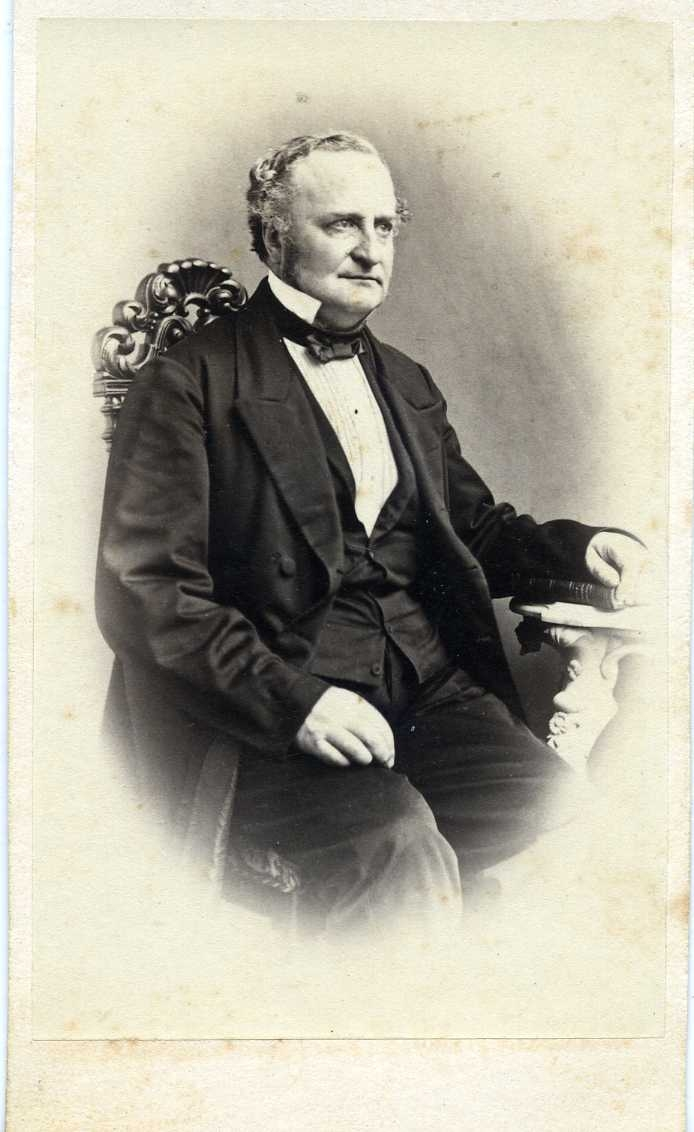 Porträtt av en riksdagsman sittande vid ett bord. Autograf på bildens baksida.
