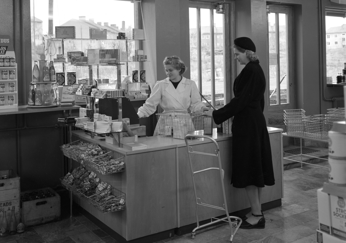 Bildsvit från Frits Thybergs speceriaffär på Kvarnberget, kanske ett av Karlstads första snabbköp. Butiken fanns på Jössegatan 7 där ett politiskt parti nu är hyresgäst. Bilden tagen år 1951.