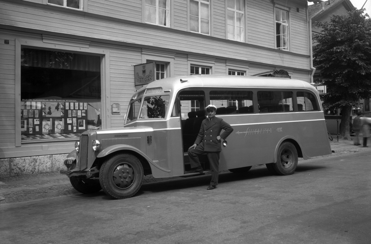 Turistbuss framför turistbyrån på Herrgårdsgatan 22 i kvarteret Gripen. Bilden tagen 1935. Huset var tidigare bostad åt borgmästare Lindholm och före honom rådman A F Grundström. Se bild 818-162.