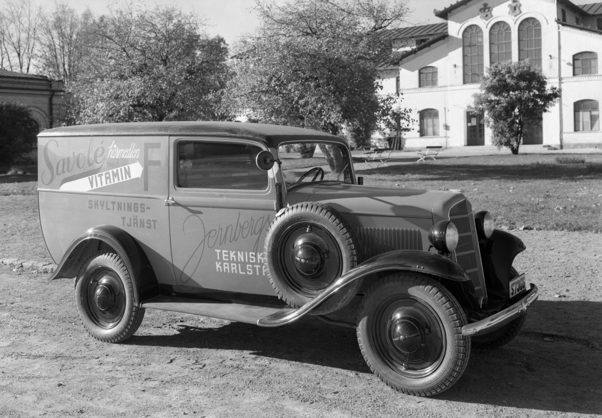 Skåpbil av märket Opel tillhörande Magnus Jernbergs tekniska fabrik. Bilden tagen 1937 i Viken.