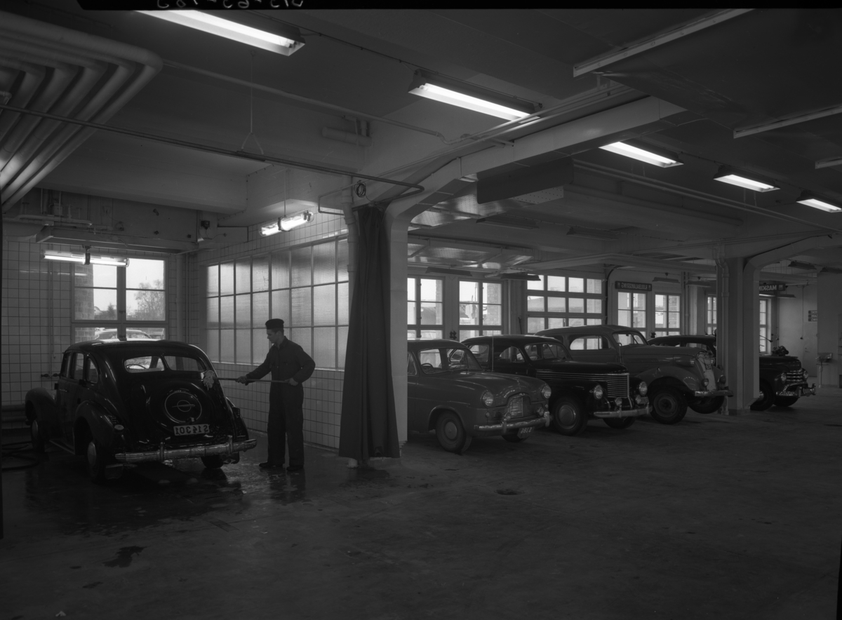 Verkstadsinteriör från Motorkompaniet som låg vid Nobelrondellen, på den plats där det nu finns en snabbmatsrestaurang. Bilden från mitten av 1950-talet.