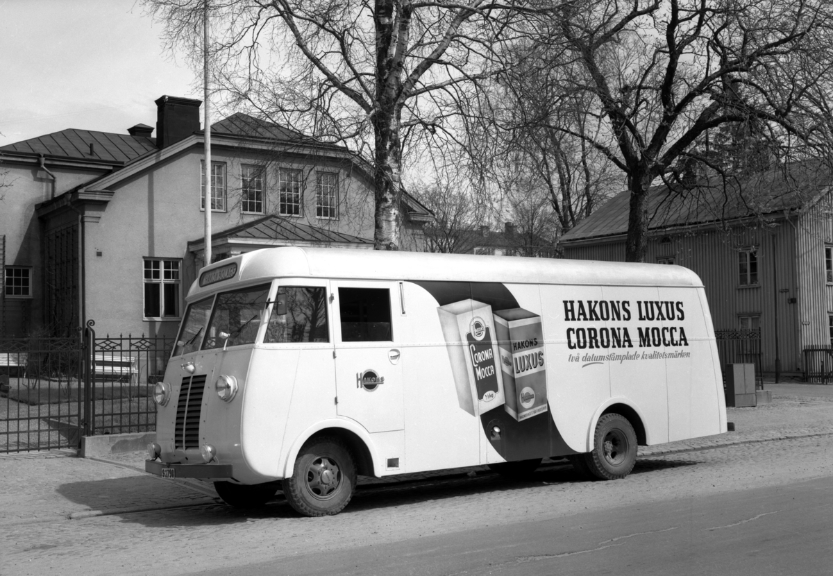 Hakonbolagets kaffebuss utanför kontoret på Drottninggatan 4 i kvarteret Freja år 1951.