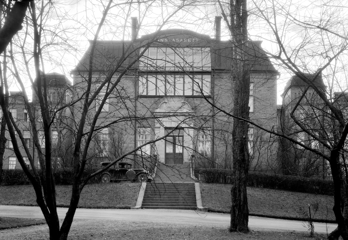 Bildsvit från länslasarettet med omgivningar tagen mellan 1905 och 1961. Huvudentrén år 1935.