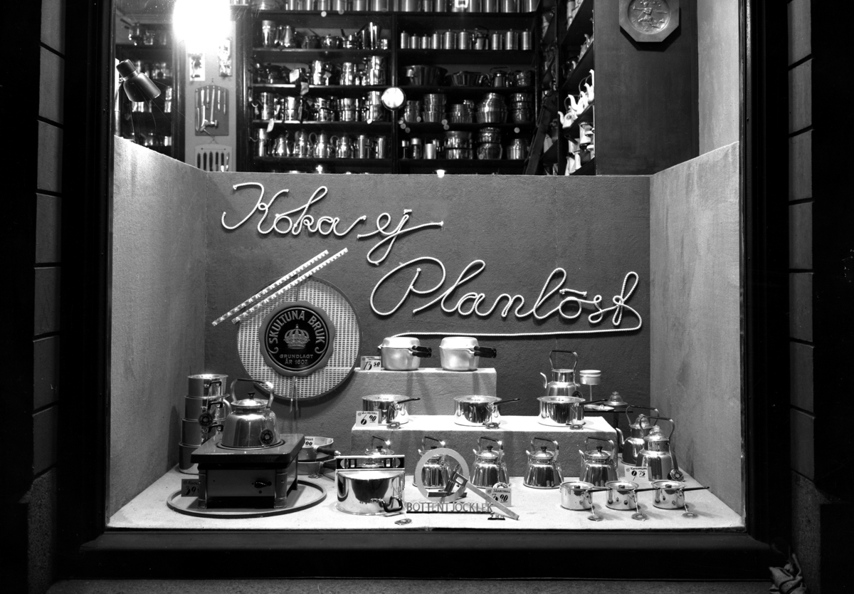 Husgerådsskyltning i Nygren o Åhlins fönster år 1938.