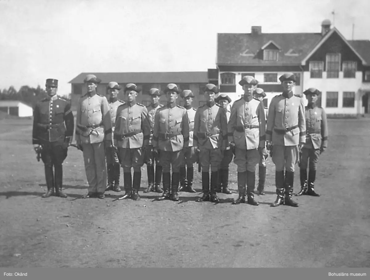 På baksidan fotot står följande: "I parad för överstelöjtnant Kraak; Korpral Stern (första ledet) Ego T2, Rönström Tv. Månsson T4, Schütz T.5, Fries T.1, Hedsten T.2, (bakre ledet) Wikander T.5, von Essen T.5, Lüning T.2, Svensson T.6, von Werdenkoff T.1, Lundborg T.5"